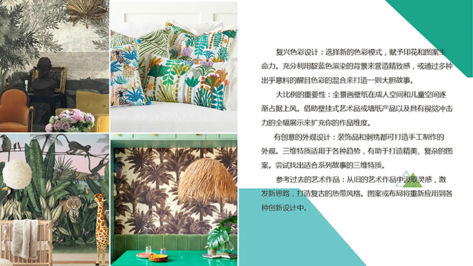 各种野生动物是热带风情图案上的亮点,它们不仅为图案增添了角色,而且为设计增添了乐趣感 这种设计趋势吸引着各个年龄层的动物爱好者们。设计可以混和搭配的产品系列, 消费者可依据自己的喜好对产品进行搭配,从而实现产品个性化,是理想的馈赠佳品,各种密集设计方式受到了大家的青睐,它们为策划有趣的故事和意想不到的动物搭配提供了 足够的空间。