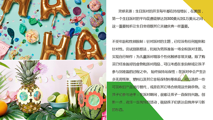 生日派对的开支每年都在持续增长,在美国,第一个生日派对的平均花费能够达到300美元到1万美元之间,这一重要转折让生日变得跟其它关键庆典一样重要。不受年龄和性别限 制:针对派对的主题,已经没有任何规则和针对性。尝试创新想法,比如为男孩准备一场全粉派对主题。实现自行制作:为儿童派对增添个性化触感非常关键。除了购买已经准备好的食物和派对用品,可以考虑在家自制或让孩子参与到准备的过程之中。始终保持环保性:在派对中会产生许多无用纸张、塑料以及其它非环保材料等废品。可以选择一些可回收的产品进行替代,或是在其它场合使用这些剩余物。让孩子们参与进来:在派对期间,很难让孩子一直保持兴趣。创新一点,鼓励孩子们表达自我并学习新的东西。