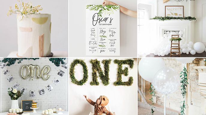 第一个生日庆典可以选择无性别和中性风格,采用一种精致的天然色调、绿植元素以及环保派对用品,比如竹制餐具套件和可回收的纸质邀请函。关注于极简风格,采用不同尺寸的清爽白色气球、大幅的银色锡纸字体横幅以及刚刚修建的绿植,呈现一种精致的现代观感,谈及蛋糕,简单为佳。在最上层添加一些极简花朵,搭配这一主题。